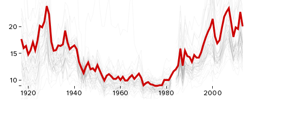 前一個圖是最終效果圖,第二個圖是我自己做的。因為數(shù)據(jù)是從1917年開始的,所以我自己做得時候怎么都設(shè)置不到橫軸坐標軸從1920年開始!