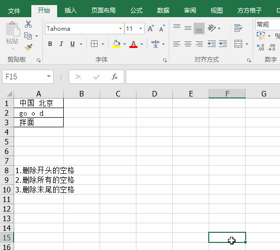 今天我介紹一個簡單高效的辦法,借助方方格子中刪除空格的功能,我們輕松刪除不同情況下的空格,請看動畫: