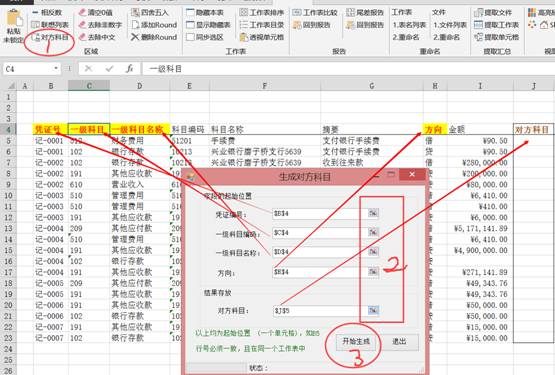 點(diǎn)擊【對(duì)方科目】-在彈出窗口中選擇四個(gè)關(guān)鍵字段“憑證號(hào)”“一級(jí)科目編碼”“一級(jí)科目名稱”“方向”,然后選擇生成對(duì)方科目的存放位置,注意,一定要存放在第一筆憑證的起始行的某一列,如圖示。