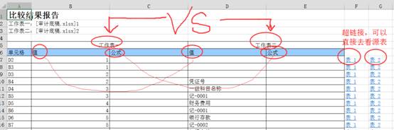 點(diǎn)擊【比較結(jié)果報(bào)告】的最右超鏈接可以追溯到被比較表和比較表的相關(guān)單元格,點(diǎn)擊【回到報(bào)告】快速返回到比較報(bào)告中。