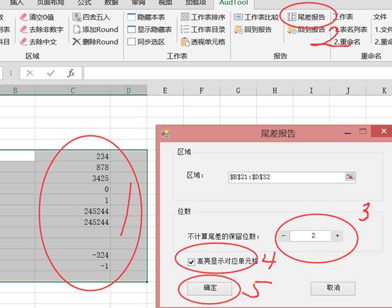 選中(也可以后選)要檢查的區(qū)域,點(diǎn)擊【尾差報(bào)告】-點(diǎn)擊選擇要【不計(jì)算尾差的保留位數(shù)】-可以勾選【高亮顯示對(duì)應(yīng)單元格】可以對(duì)檢查區(qū)域有尾差的進(jìn)行高亮顯示,點(diǎn)擊【確定】,生成報(bào)告