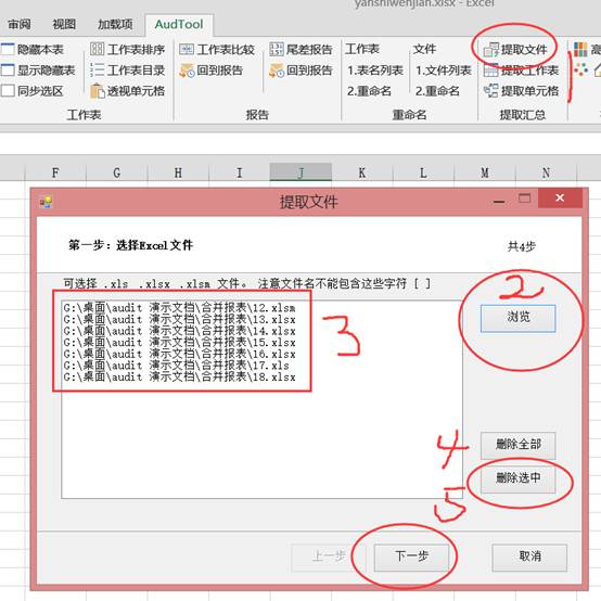 點(diǎn)擊【提取文件】-彈出提取文件窗口,點(diǎn)擊【瀏覽】選擇文件夾,選擇文件夾中的文件(按Ctrl+a可以全選),點(diǎn)擊【確定】后窗口列示了所有的要提取的文件列表,可以點(diǎn)擊其中的任何一項(xiàng)進(jìn)行刪除選中,也可以不管直接下一步。