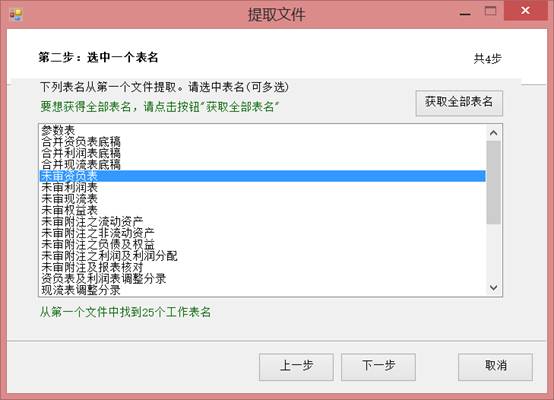 第二步,程序會(huì)獲取我們選擇文件夾中所有工作簿中工作表的名稱,然后我們選擇要提取的工作表名稱,比如我選擇的是“未審資負(fù)表”,點(diǎn)擊【下一步】。