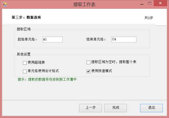 第三步驟,勾選“提取區(qū)域?yàn)榭諘r(shí),提取整個(gè)工作表”是在不輸入提取單元格區(qū)域的情況下,將提取每個(gè)工作簿中的指定工作表全部內(nèi)容,相當(dāng)于匯總工作表。同時(shí),一般情況下建議勾選“使用快速模式”,因?yàn)檫@個(gè)模式提取速度快,如果不勾選,程序?qū)⒈闅v選擇的工作表所有區(qū)域判斷是否有內(nèi)容,快速模式只判斷工作表前幾百行和前幾十列是否有內(nèi)容,如果前幾百行前幾十列都沒有內(nèi)容就認(rèn)為整個(gè)工作表都沒有內(nèi)容。