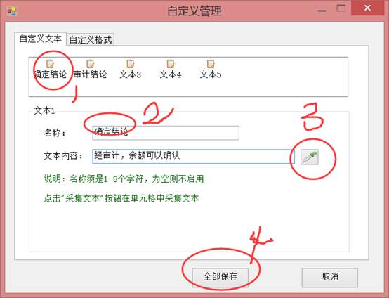 有時(shí)候?qū)徲?jì)底稿的結(jié)論是固定的,每次都手打重復(fù)又浪費(fèi)時(shí)間;同樣輸入某些符號(hào)(如:√)每次都很難找,同樣每次對(duì)底稿設(shè)置常用的數(shù)字格式,以及邊框,背景色,等都重復(fù)又麻煩。有了自定義管理就可以提取我們常用的文本,符號(hào),格式保存下來,每次點(diǎn)擊一下批量完成我們需要的文本,符號(hào),格式。