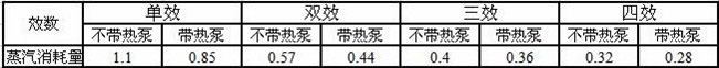 蒸汽消耗:帶熱泵的降膜蒸發(fā)系統(tǒng)的能耗與不帶熱泵蒸發(fā)系統(tǒng)的蒸汽消耗情況如下表。